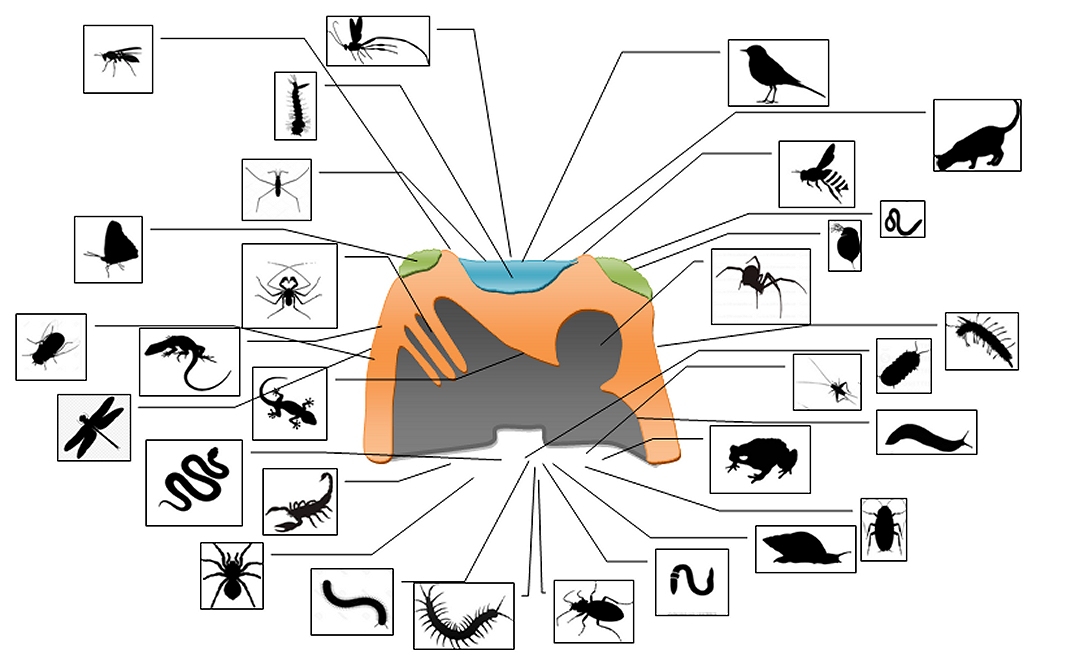 Eco-Rocks are faux rocks that inside have compartments suitable to shelter different types of invertebrates and small vertebrates, offering a humid environment and a place to hide during day time and also a place to hibernate during winter. In addition, on the outside, it can also offer water for a multitude of animals.