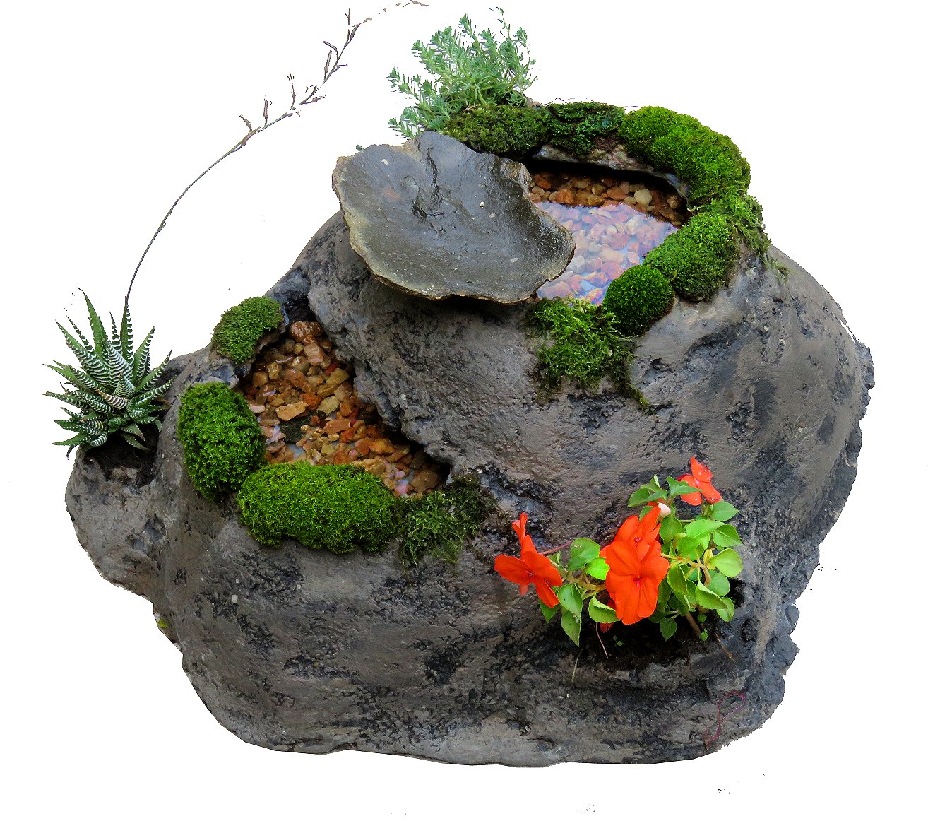 It consists of a small pool on top of the rock and several pouches for plants on the sides and an entrance to the main cavity inside. It might have a platform as a bird feeder, where you can deposit some food for them and they can use the pool to have a bath. The pouches can contain ferns, succulents, etc.